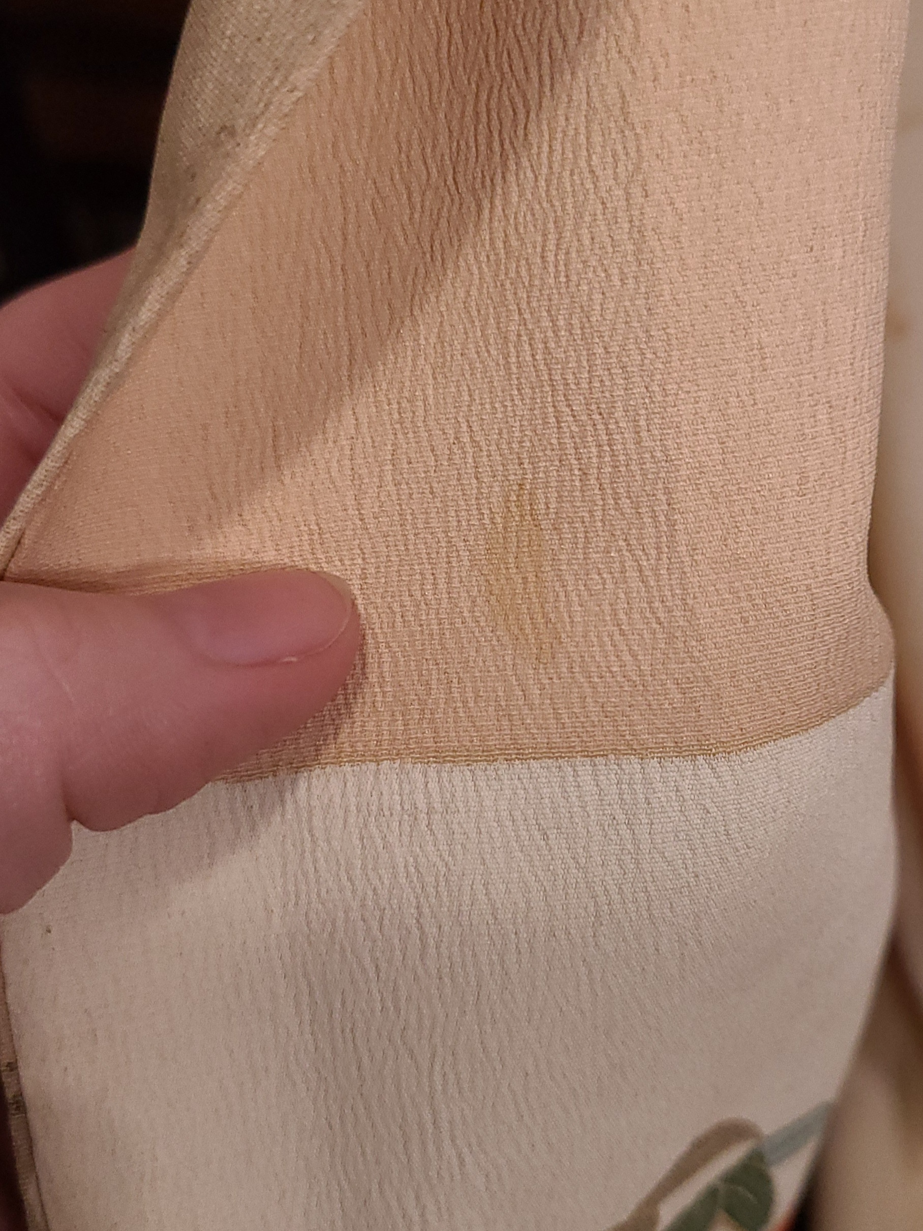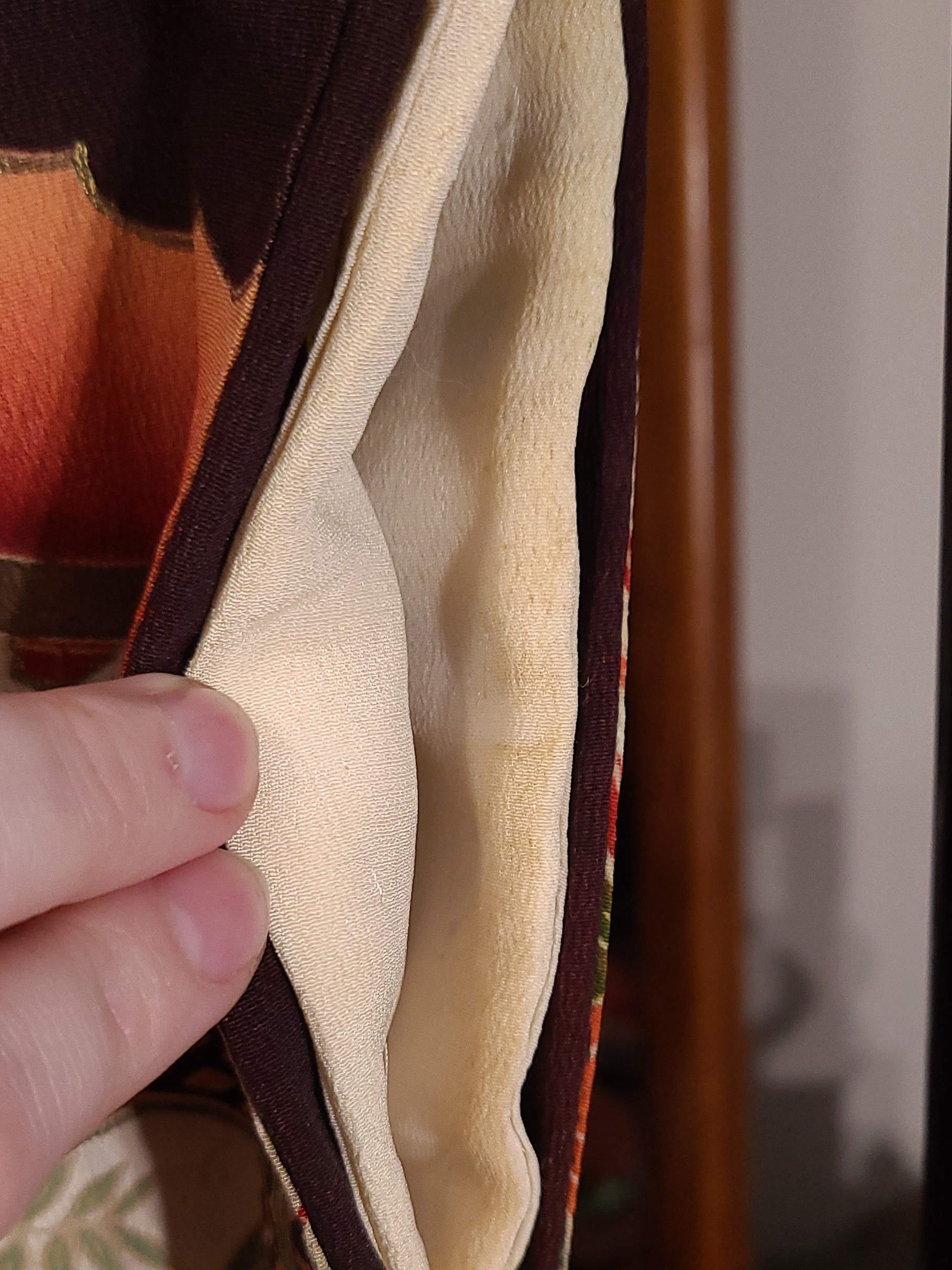 And now, of course, let’s talk about the filth. First, this thing has a hiyoku, or a second layer in this context, sewn in. In this case, it’s actually kind of a fake one. It’s partial. I’m going to have to remove it from the kimono to do reductive bleaching on it, because let’s be frank: when it’s this fucking bad, I’m not going to piss around with vinegar.