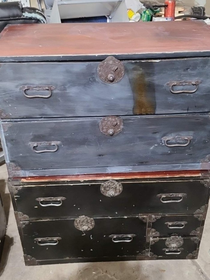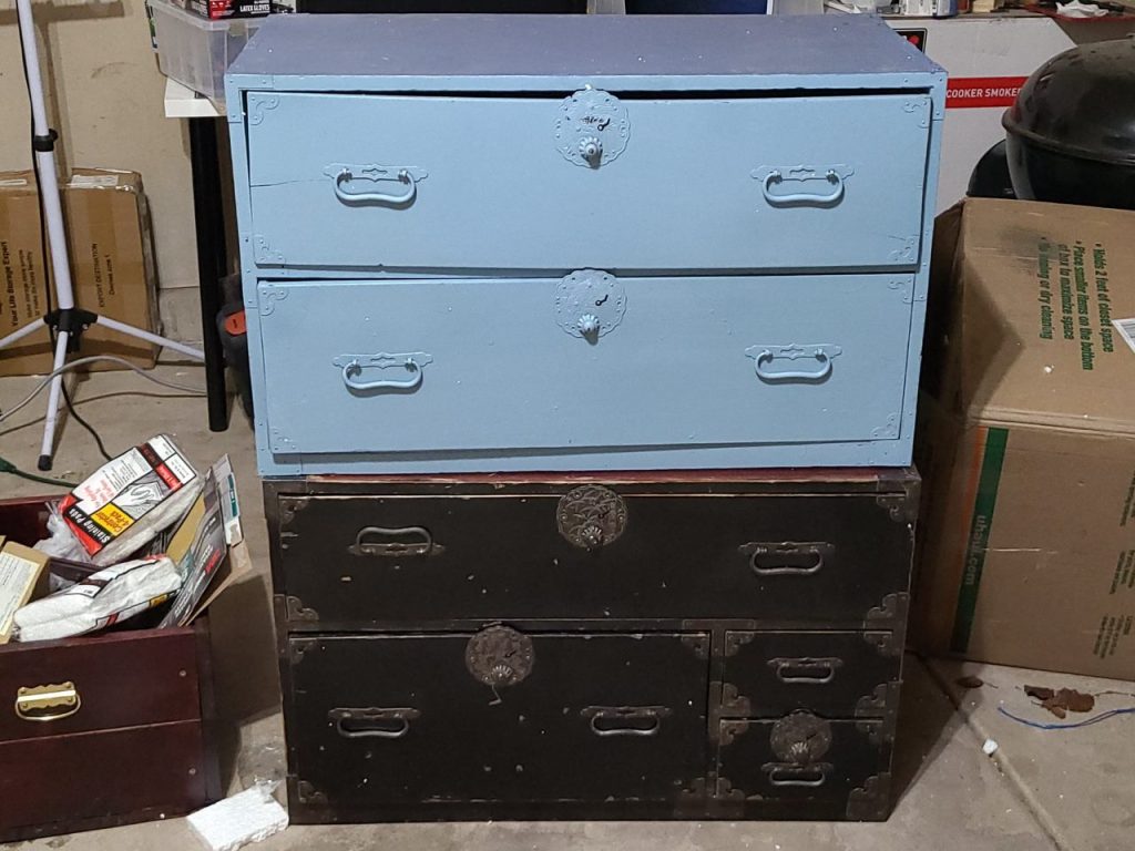 Yeah. You see that? Some basic bitch out there decided to sHaBbY cHiC oMg UpCyClE with shitty blue-grey craft paint a legit antique Japanese Tansu. And Jesus Christ did they do a terrible job. They even painted over all of the hardware. Even the locks. And with them all the way in Tennessee, myself in Chicagoland, it was out of my reach. I agonized over that shit for days, guys. Like I bitched about it on my own social media, and I also drove my family members insane complaining about it because I definitely have healthy coping mechanisms for things that drive me bonkers. The idea that I couldn’t just grab a friend with a truck and just go get the fucker made me vibrate with dismay. Vibrate I tell you.