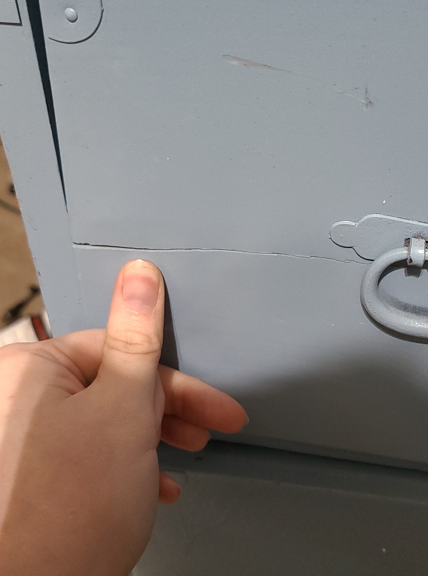 Along the side there where the handles are, they switched paints. They went from shitty grey blue craft paint to what I’m absolutely sure is fucking Rustoleum spray. It even bubbled and had a shell like Rustoleum does. Also there’s THIS SHIT:
