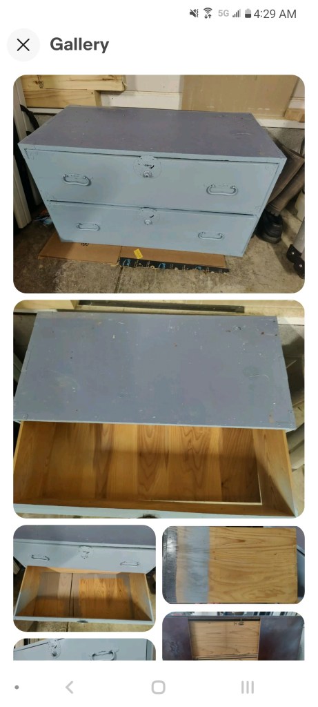 Okay so it’s also banged the fuck up in pretty rough shape even over the craptastic paint job. We’ve got nicks and a sizeable crack in the topmost drawer there. I can handle that. Let’s see how we–HOLD UP.