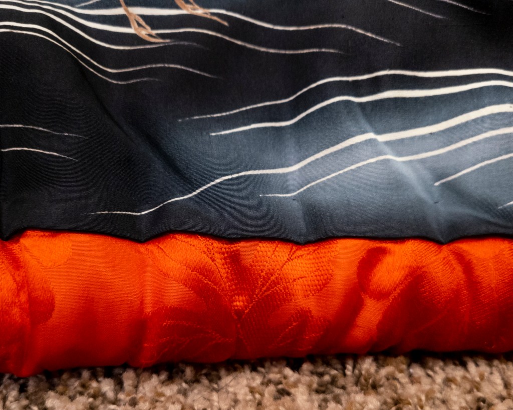 Something that I was pretty excited about was the use of heavy jimon (woven pattern) on the red lining. I’ve seen it before on antique uchikake, but I didn’t own one that came with it. I have one, but I restored it with a lining with jimon rather than it being original to the piece. The Mt. Fuji uchikake has a very smooth, soft red lining, and the temple uchikake with all of the couching has a thick red chirimen (crepe) lining.