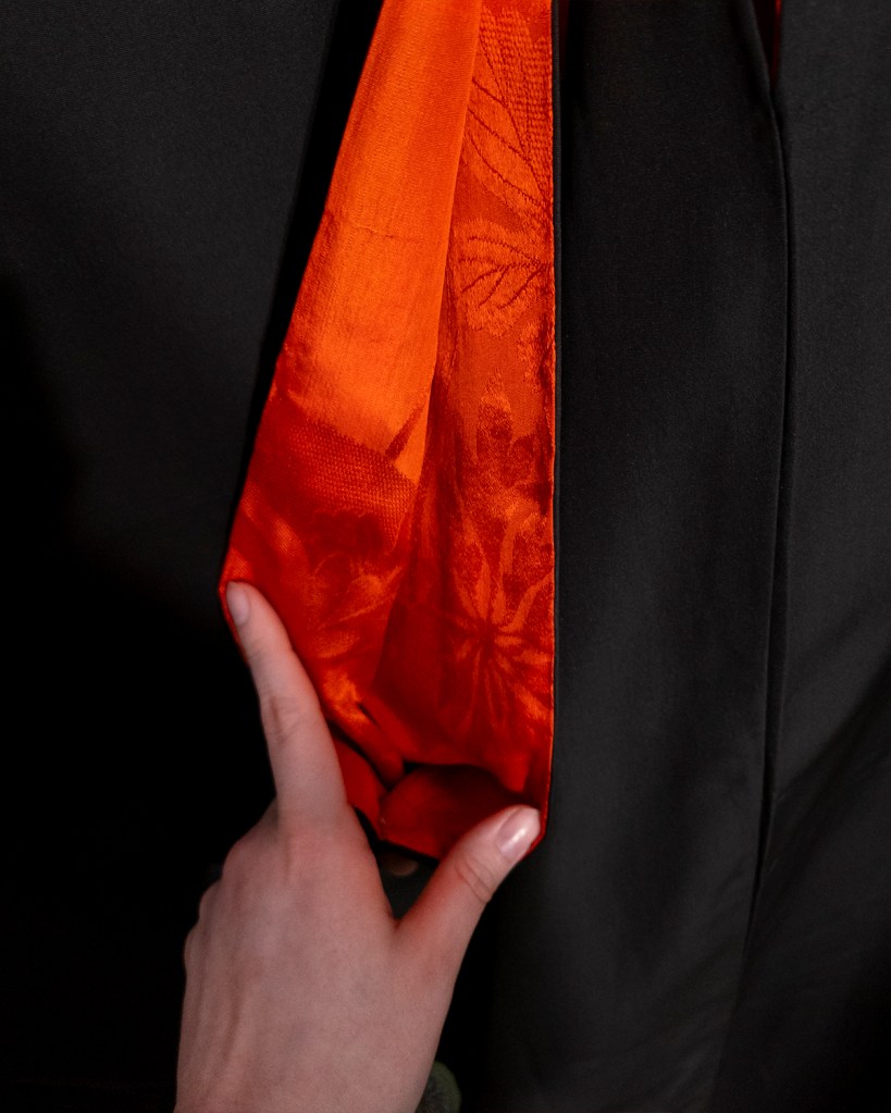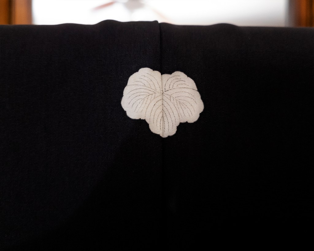 The crests in the front are decorated with tsuru as well! This makes this the first short sleeved kuromontsuki (black kimono with five crests) style uchikake that I’ve encountered that has a pattern above the hem. I suspected that perhaps the sleeves had been shortened or modified, so I took the time to pop a seam in the left sleeve to have a peek, and I see no evidence of that. Which means it was designed like this on purpose.