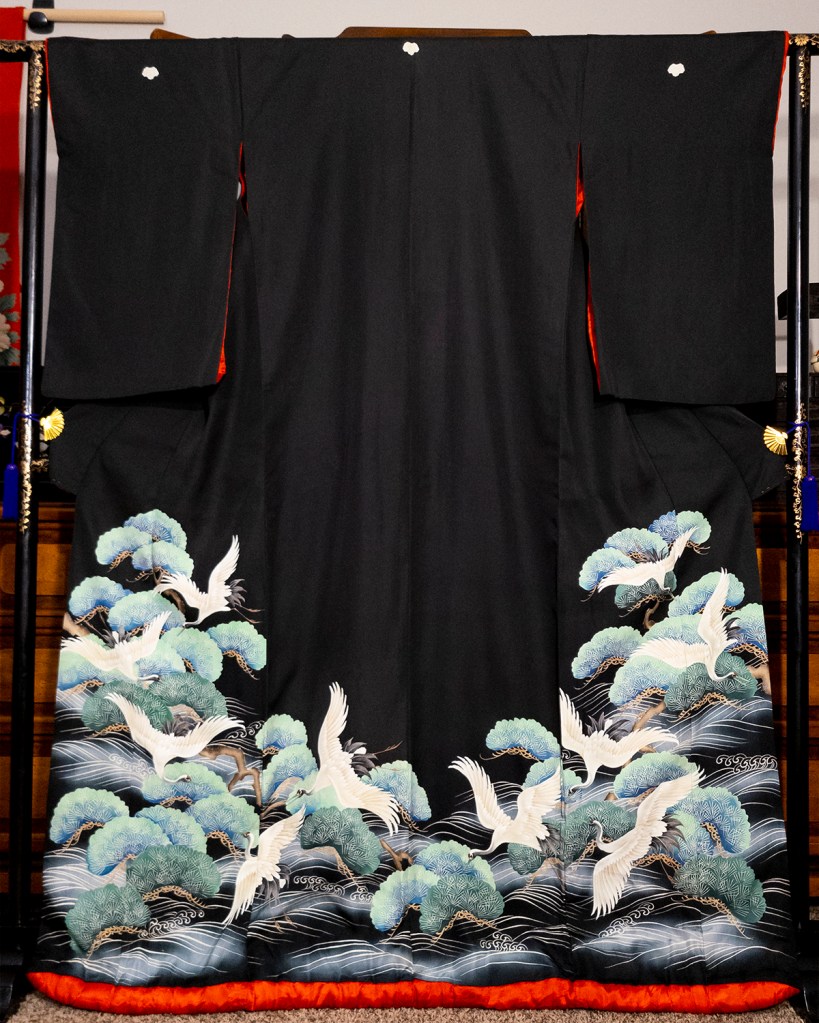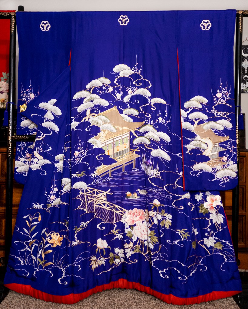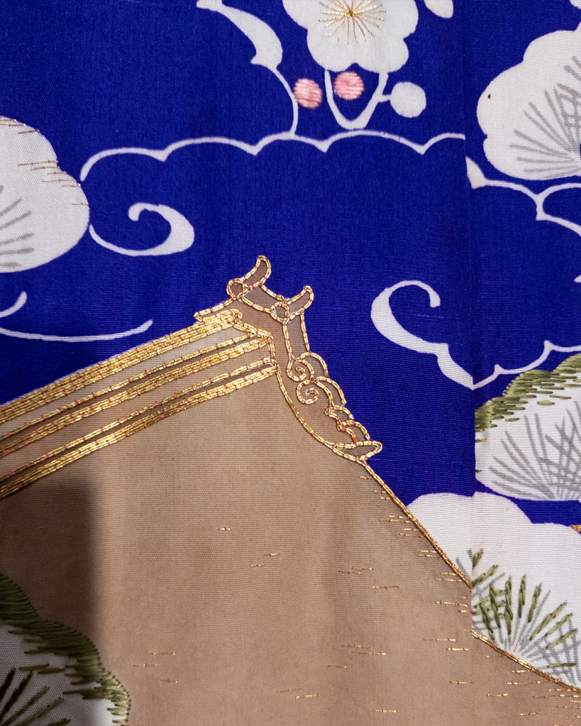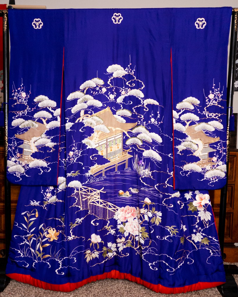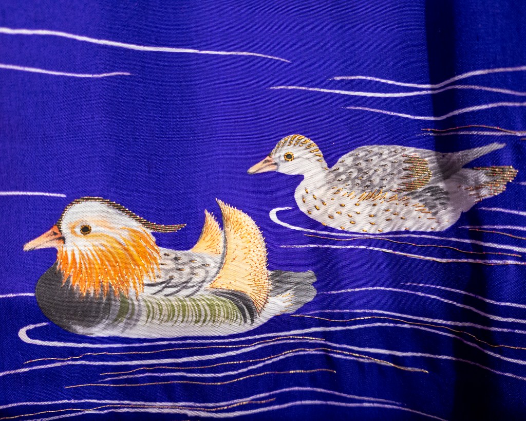 I have probably said this somewhere in the neighborhood of nine billion times, but I adore things that are picturesque. That’s probably why I find myself having such the crippling addiction soft spot for antique uchikake, because they’re basically walking scenery. Look at this one; someone’s peaceful house on a lake, peeking out from clearing mist and nestled in a cluster of matsu (pine trees). It’s warm out–the flowers are blooming, and the ducks are getting ready to fuck pair off. Serenity, warmth, and partnership depicted on this majestic and near immaculate piece from the late Meiji Era.