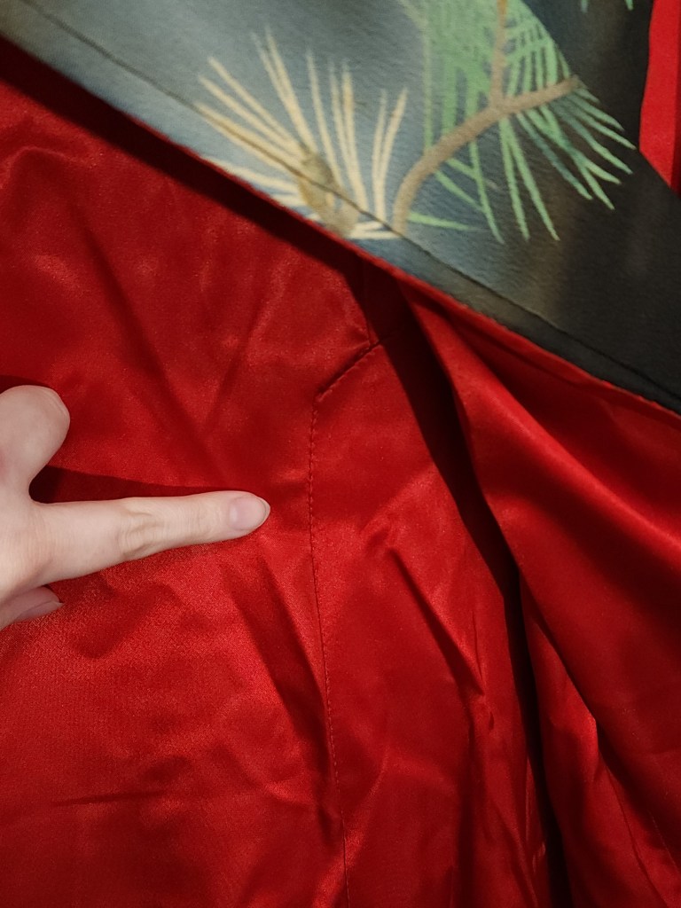 This is absolutely not an original red lining. How do I know that, other than the tailoring? Because it’s synthetic satin and not momi (red silk lining fabric). Burn test most closely resembles rayon, which makes sense because polyester isn’t going to be commercially available in fabrics for a few years after this was done.