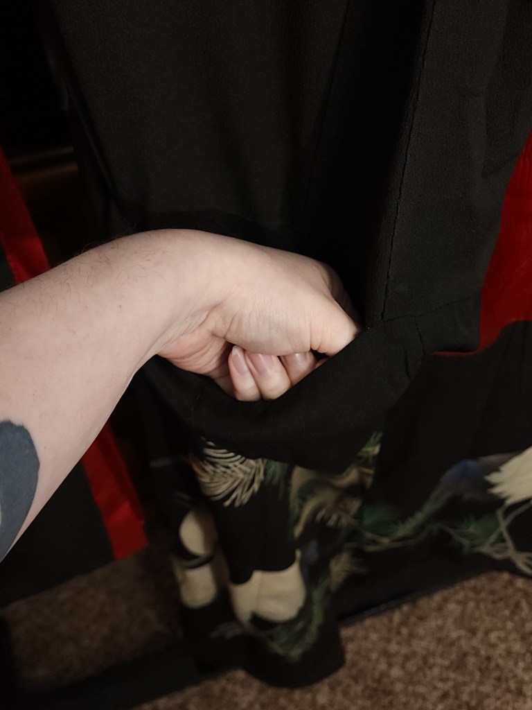 And then there’s the fucking hem. At some point, it made contact with something that was corrosive. Whatever it was, it discharged some of the dye and ate the silk. It could have been chlorine bleach, but I would actually expect the damage from that to be significantly more…what’s a good word to use here…fucking catastrophic. Luckily, it’s stabilized now, so these aren’t trying to shatter. Which is surprising, and it tells me that there’s a non-zero chance that it was noticed when it happened, and that steps were taken to minimize the damage.