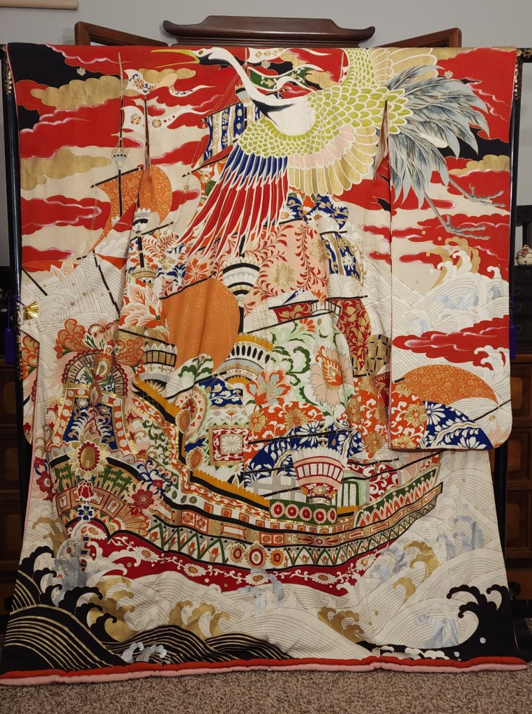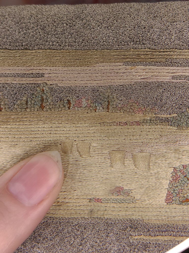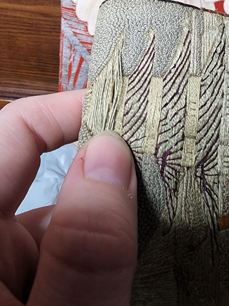 I took those pictures in my lap the moment it arrived. I am so fucking professional. Our two major issues are busted-ass embroidery stitches and that she’s filthy. I got it under my big fuck-off lens to see how filthy. Basically years of being handled have matted down the knots and discolored a shit ton of the imagery.