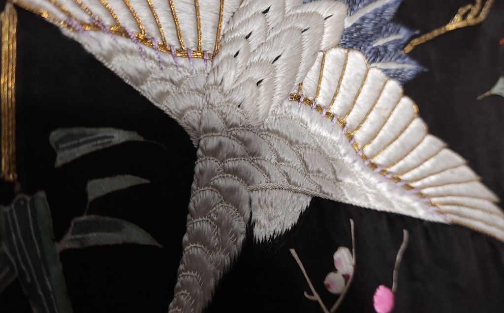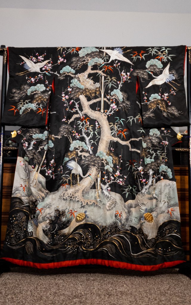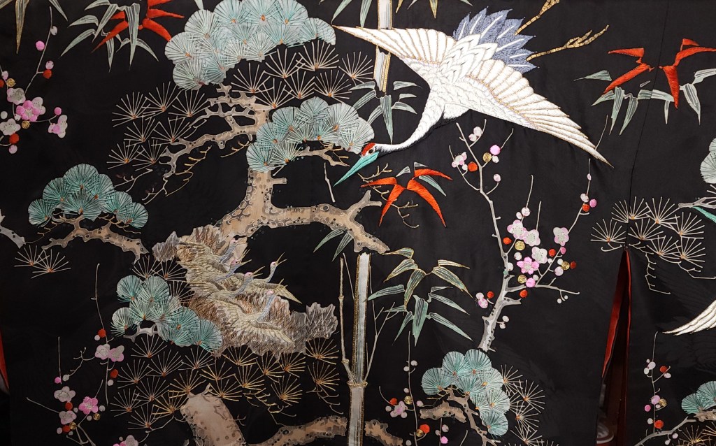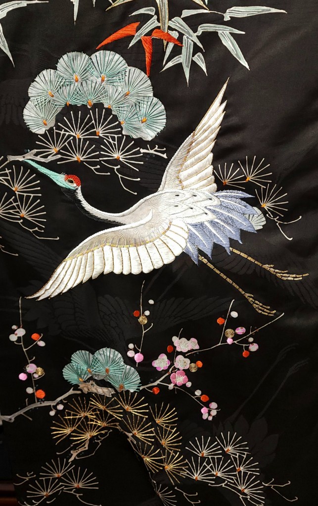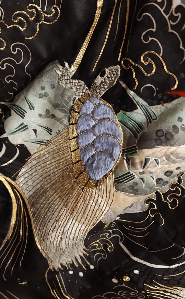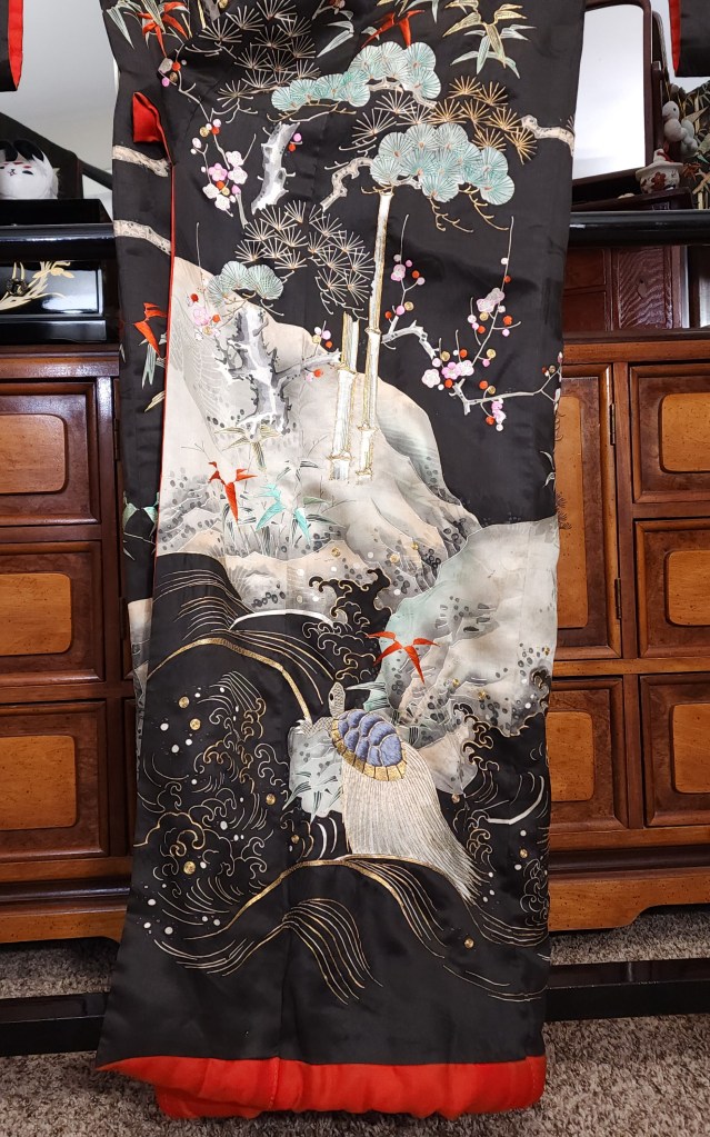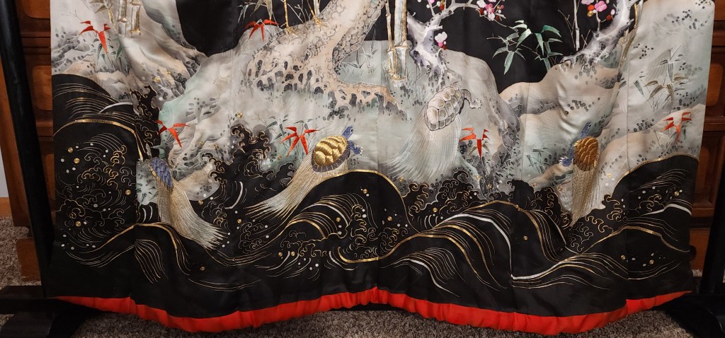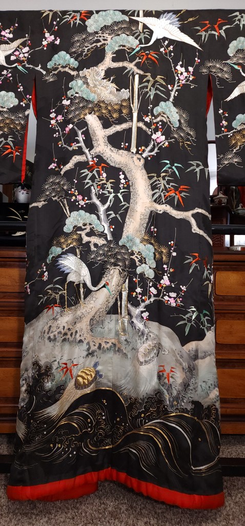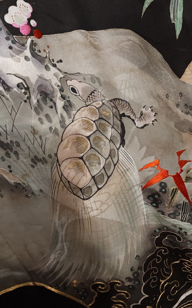 What you’re looking at, then, is a beautiful Meiji Era (October 23, 1868 – July 30, 1912) uchikake–the outermost garment of a bride’s wedding ensemble. The short sleeves are normal for this era. The heavily couched embroidery on a deep, beautifully soft and shiny jimon (pattern woven into silk) of tsuru (cranes). It features an amazing old growth matsu (pine) that is surrounded by branches of ume (plum blossoms) and leaves of sasa (bamboo), completing the shochikubai theme which is a great favorite of mine. A the hem, emerging from crashing nami (waves), we have four majestic minogame (old tortoises with moss growing from their backs).