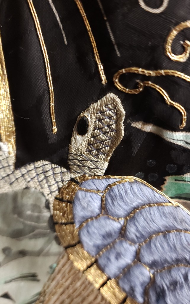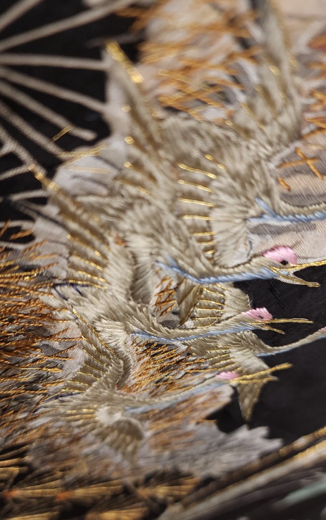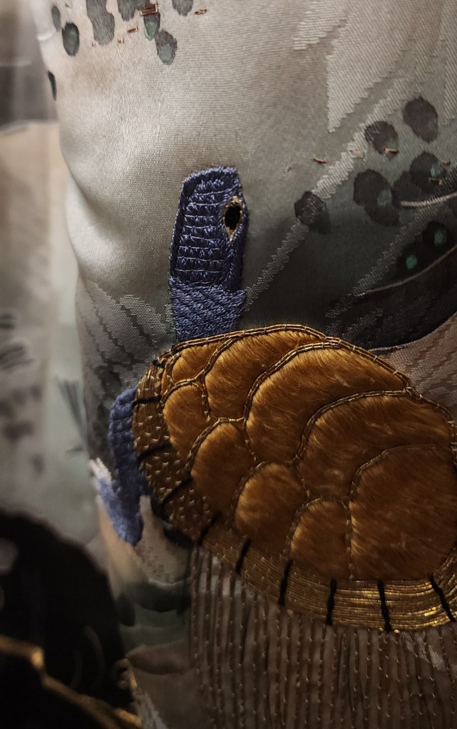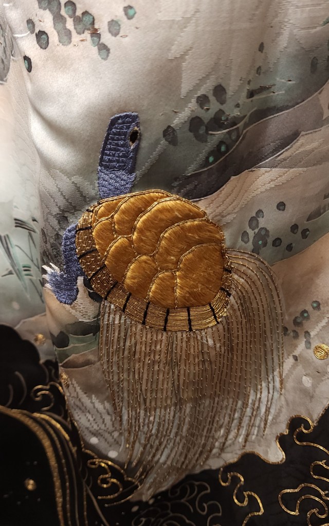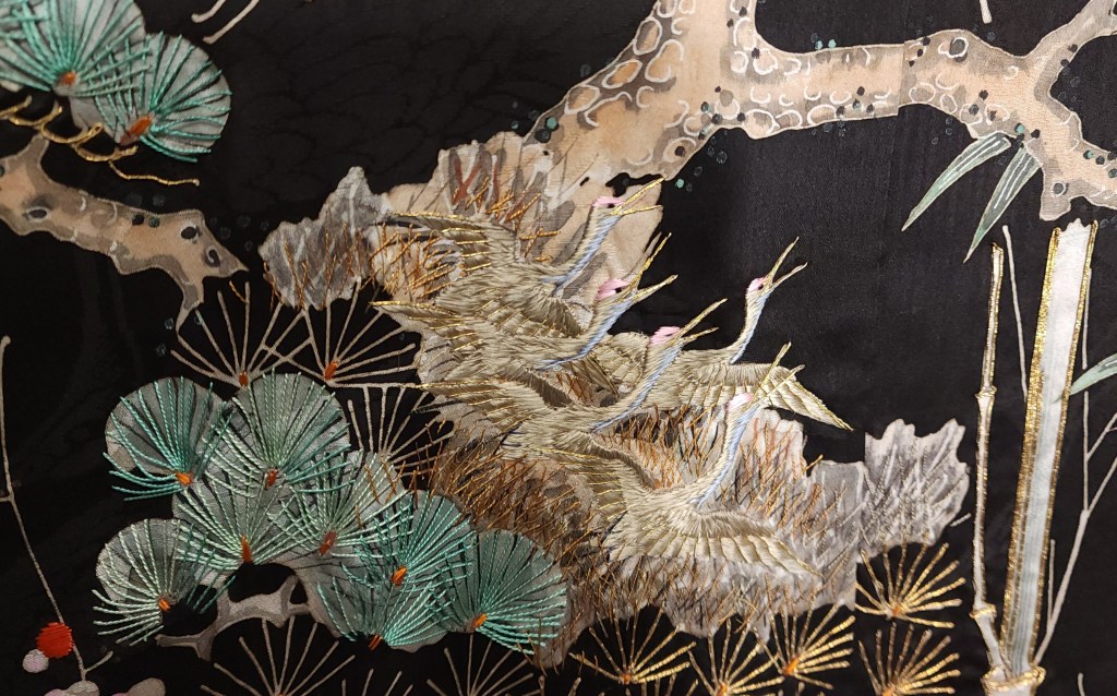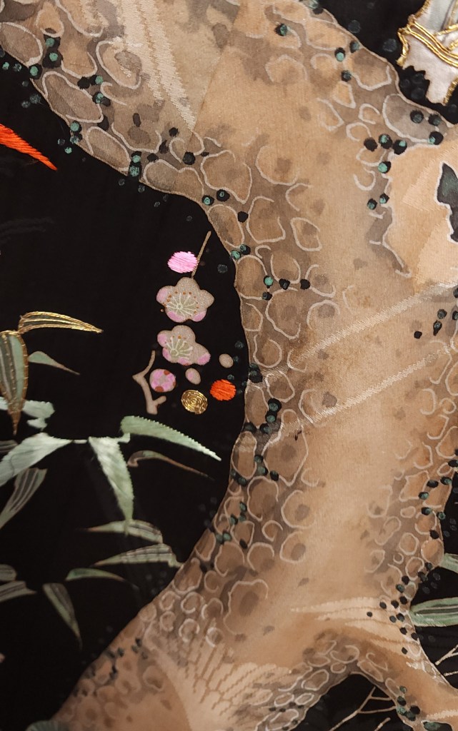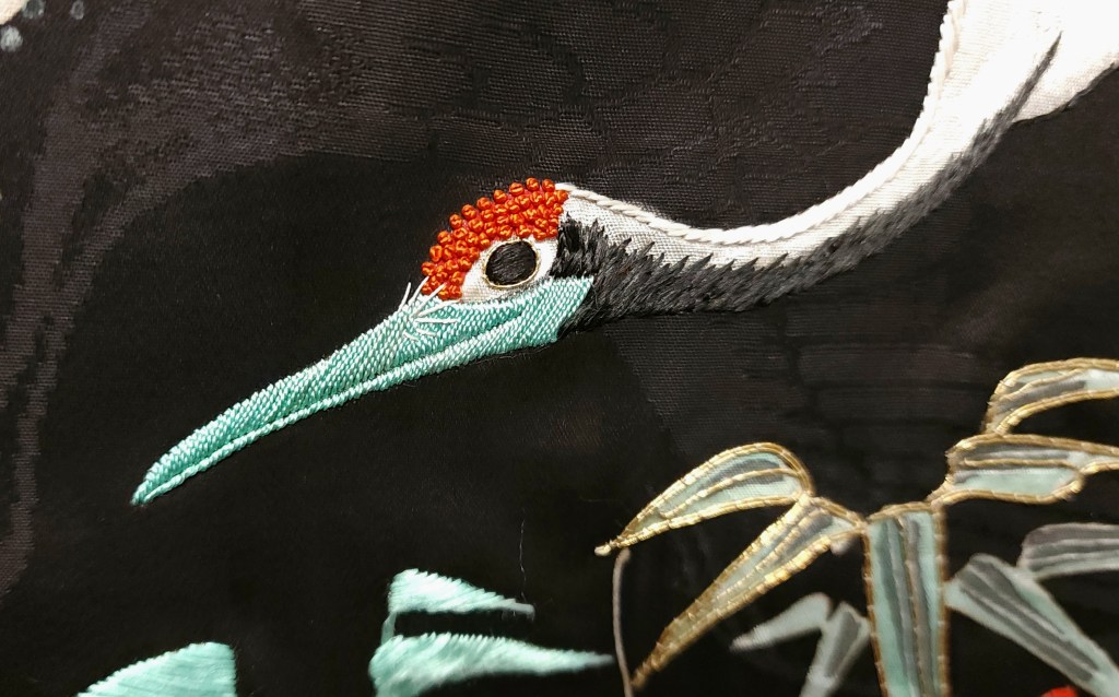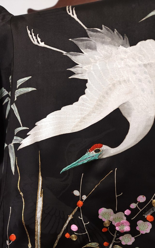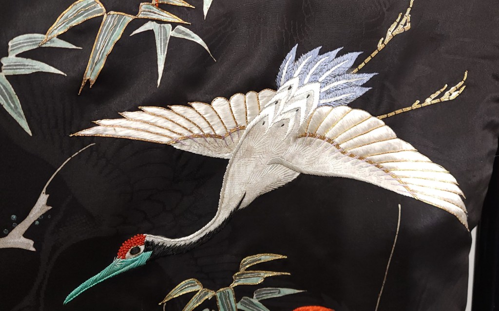 What you’re looking at, then, is a beautiful Meiji Era (October 23, 1868 – July 30, 1912) uchikake–the outermost garment of a bride’s wedding ensemble. The short sleeves are normal for this era. The heavily couched embroidery on a deep, beautifully soft and shiny jimon (pattern woven into silk) of tsuru (cranes). It features an amazing old growth matsu (pine) that is surrounded by branches of ume (plum blossoms) and leaves of sasa (bamboo), completing the shochikubai theme which is a great favorite of mine. A the hem, emerging from crashing nami (waves), we have four majestic minogame (old tortoises with moss growing from their backs).