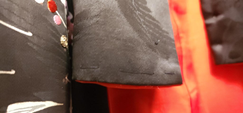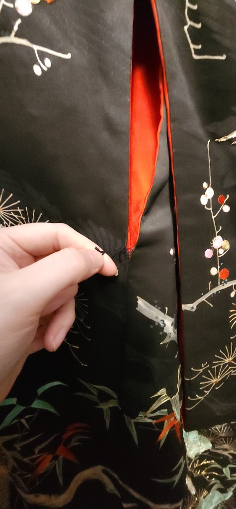 It wasn’t much at all. Just a few tiny imperfections in the form of popped seams and an undone couching stitches. But really, that was it. LOL Ever do so many of these repairs that you don’t even bother to take it off of the iko to take care of them? I just left it hanging there and tidied up the stitching. The longest part to fix was in the armpit area under the sleeves. And legit, that area is so frequently popped that I am basically ready to do this repair every time I bring in a kimono.