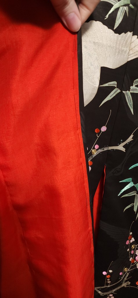 I don’t often get to say so little about these things, honestly, I was expecting it to arrive in significantly worse shape than it did. Typically my domestic purchases are really fucky. They’ve been turned into fashion or bath robes, or they’ve been dragged through all kinds of things that make the momi (red lining silk) at the padded hem start to shatter. Sometimes they’ve been stored away for so long in plastic goddamn bags of all things that they have intense odors.