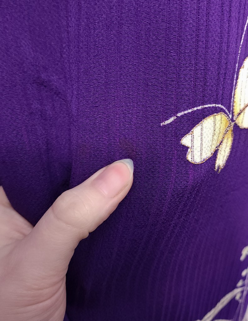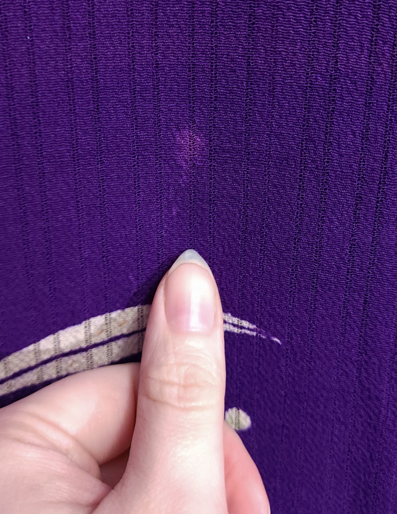 The first and most easily noticeable thing about this lining is that it’s pretty fucked. This is the thing that they were referring to when the condition of the original auction listed multiple tears and holes. And indeed, it is shattering. It also doesn’t belong here even in the slightest. This was installed way later than the kimono was made.