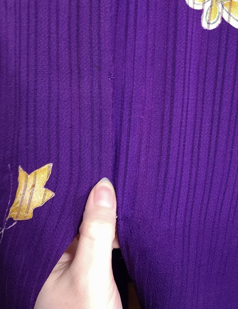 If you’re wondering why this lining isn’t supposed to be here, then that it is and what it’s made of could answer that part. But it’s actually pretty important to note that this piece isn’t supposed to have an upper lining at all. I’ve encountered many situations of pieces that survived the internment camps where linings were changed or installed with whatever they had available to them, and so this doesn’t surprise me. It’s worth noting that the presence of a hakkake doesn’t necessitate an upper lining. For its age, at this length, this kimono is meant to be hikizuri. This is not exclusively a geisha term. It just suggests a kimono is meant to be worn trailing.