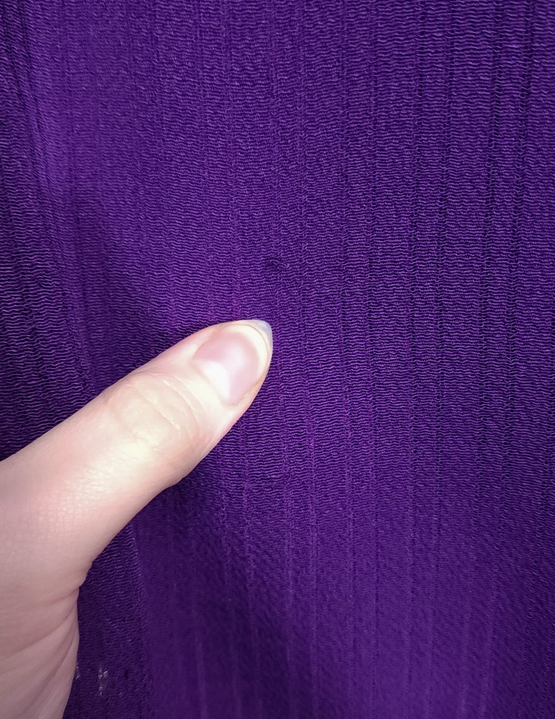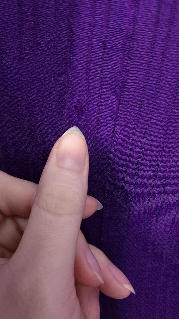 Now let’s get into some structural damage. I’m pretty happy to report that when I’m done sewing this back together, it will be completely wearable. That said, it does have some pulled threads, a hole, and some stress at the sleeve/armpit area because of fucking course it does.