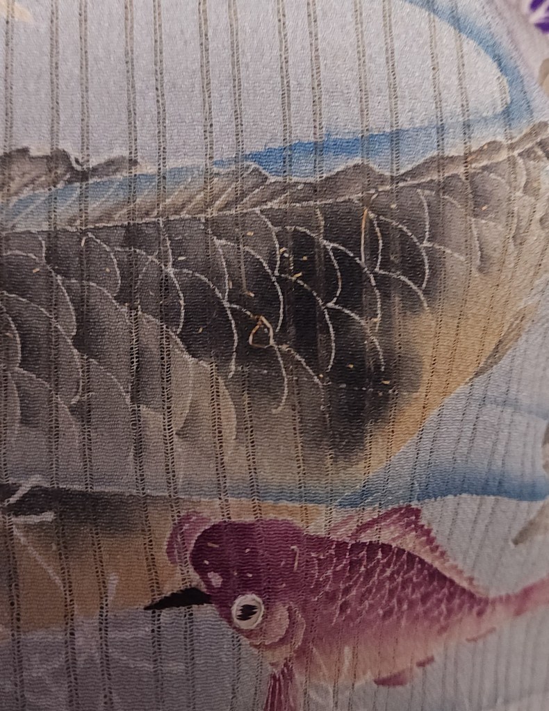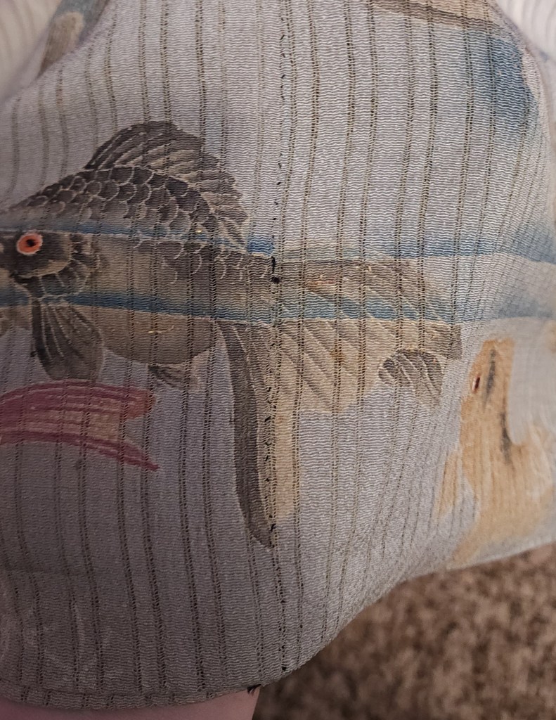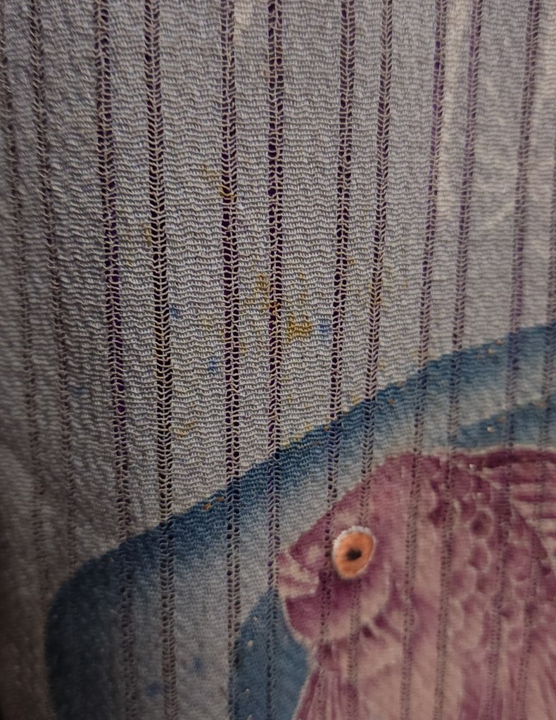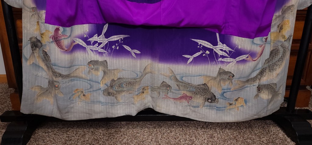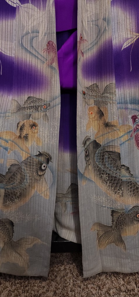 If I was going to make an exception for anything, it was going to be for this. Because I see koi. I see kingyo (goldfish). I see vertical ro (half pan style weaving for summer). I also see a purple shattering lining that, quite simply, isn’t supposed to be there.